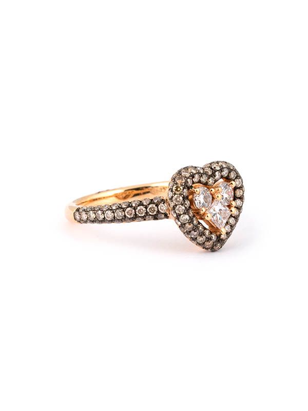 Anello in oro rosa 18kt. Gambo ornato da diamanti brown. Centrale a forma di cuore realizzato con diamanti taglio brillante circondati da diamanti brown. Anello fantasia così chiamato perché si caratterizza per il proprio design e per i materiali che interagiscono tra loro. Questo è realizzato in oro rosa 18kt e diamanti naturali e brown taglio brillante. Il numero delle pietre varia in base alla proporzione a alla misura. Gioiello realizzato in Italia. Per qualsiasi necessità o richiesta particolare, o per prenotare un appuntamento in negozio per valutare il prodotto di persona, non esitate a contattarci, siamo a vostra disposizione.