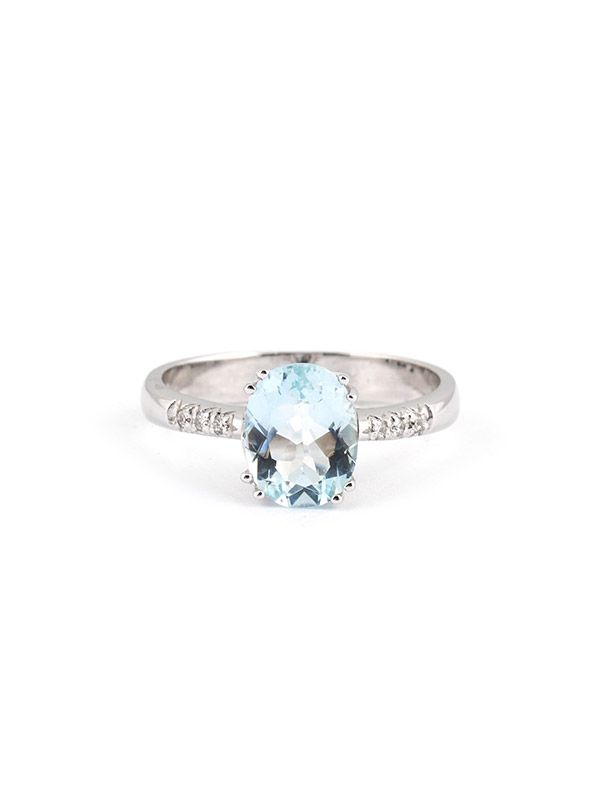 Anello in oro bianco 18kt con acqua marina taglio ovale e piccoli diamanti sulla montatura. Misura 15.