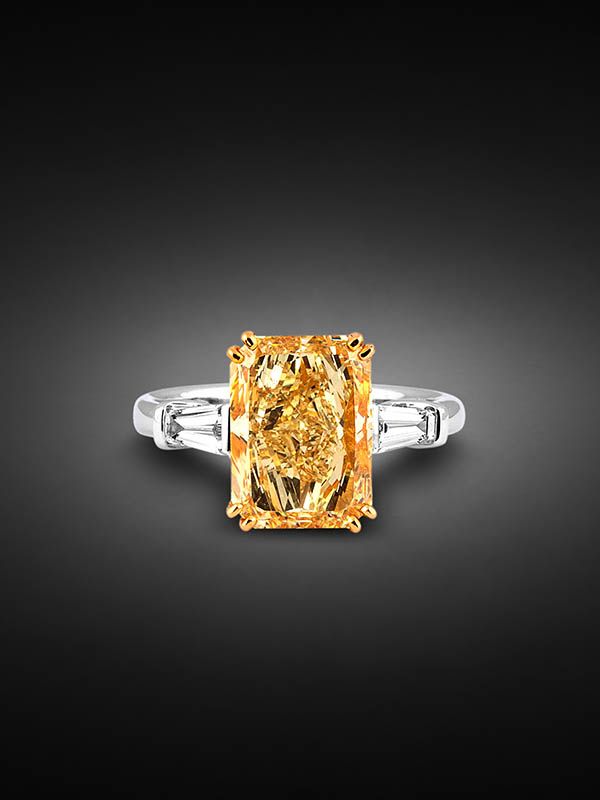I diamanti gialli si formano per la presenza di una quantità significativa di molecole di azoto nella struttura cristallina che assorbono le onde luminose blu, sono rarissimi e il loro mercato è in continua crescita e si riserva ad intenditori esclusivi. Questo anello rappresenta uno delle pietre più esclusive della nostra collezione. L’importante diamante centrale riflette al meglio il suo colore e la sua luce grazie al suo speciale taglio smeraldo. Lateralmente due diamanti bianchi continuano con linearità, pulizia e classicità. Il diamante yellow è montato su oro rosa per esaltarne maggiormente il colore, mentre la fede che veste diamanti bianchi è in oro bianco. L’esperienza dei maestri orafi permette a questa meraviglioso anello solitario la massima solidità. Un gioiello di alta gioielleria portabile ogni giorno. Oltre a garantirne la qualità garantiamo l’esclusività di questo gioiello.