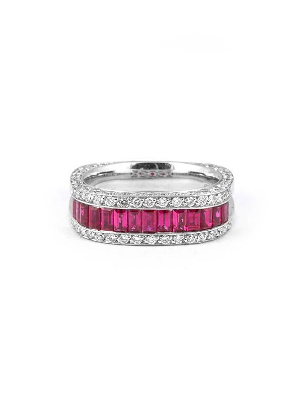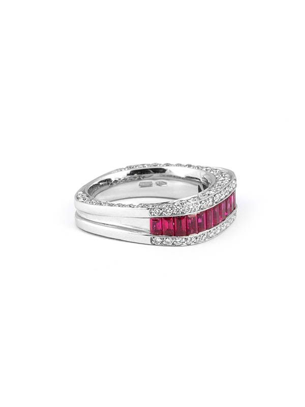 Gioiello firmato Crivelli. Anello in oro bianco 18kt con due file di diamanti e una fila centrale di rubini.
