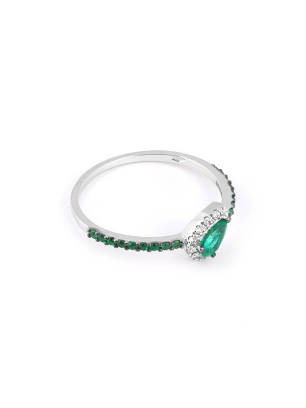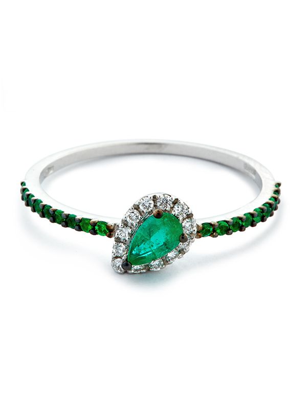 Anello in oro bianco 18kt con smeraldi taglio brillante e smeraldo taglio a goccia contornato da diamanti taglio brillante.
