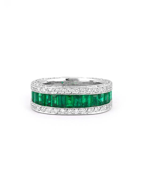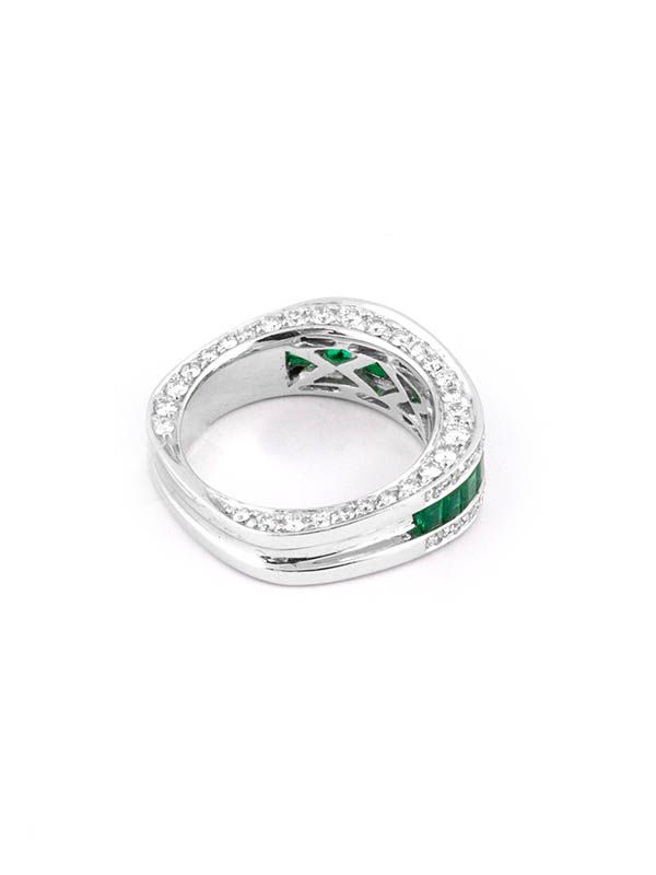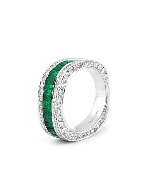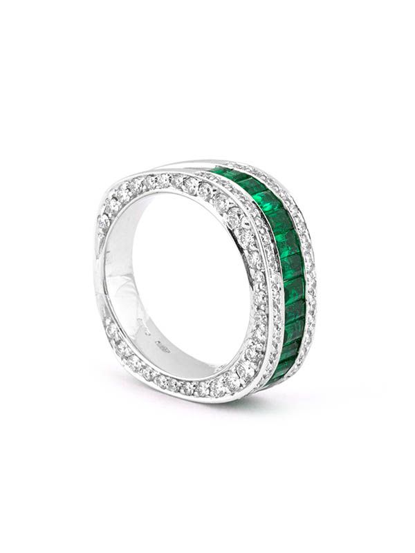 Gioiello firmato Crivelli. Fedina in oro bianco 18kt con fila centrale di smeraldi e due file laterali di diamanti taglio brillante.