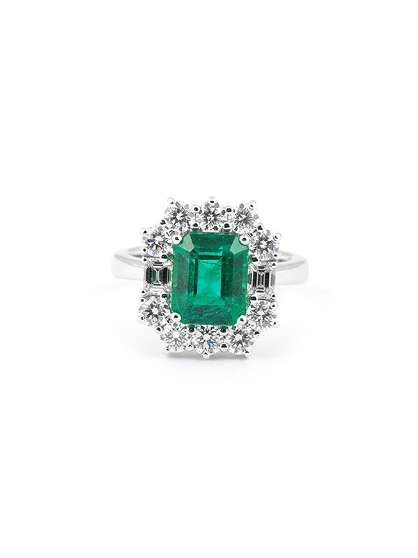 Gioiello firmato Crivelli. Anello in oro bianco 18kt con smeraldo centrale taglio ottagonale corredato di Certificato CDC (C. Dunaigre Switzerland) contornato da diamanti bianchi taglio brillante.