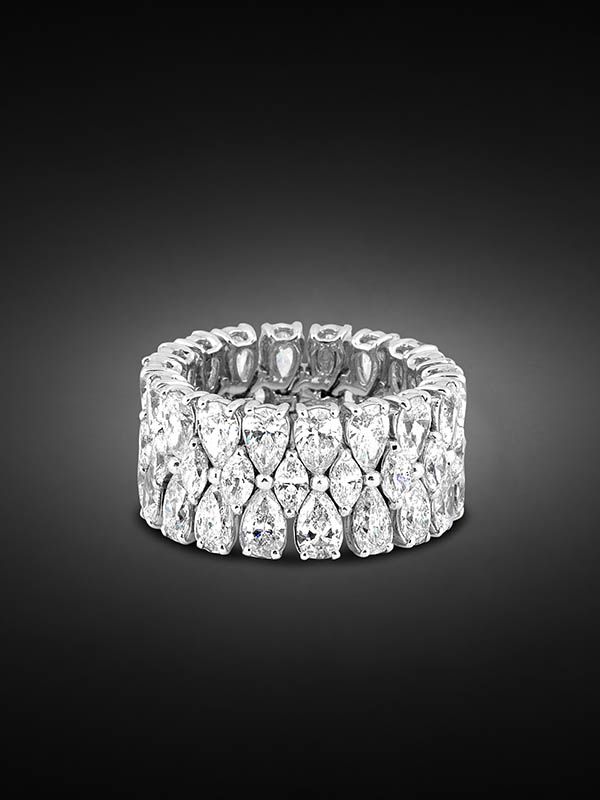 Esclusivo e meraviglioso anello a fascia morbido, composto dall’accostamento di diamanti taglio goccia e taglio marquise. Un classico senza tempo, capace di definire un profilo elegante dimostrando l’eccellenza della manualità e dell’arte orafa che lasciano la scena alla qualità massima dei materiali, esaltandolo nella sua definizione più alta. Un anello a fascia è un’eccellente idea regalo ma anche un oggetto da regalarsi e tramandare nelle linee generazionali della propria famiglia. Realizzato in diamanti bianchi taglio goccia e marquise che si accostano e uniscono perfettamente, diamanti che si alternano riempiono tutti gli spazi fino a formare l’anello a fascia più elegante della nostra collezione. Massima attenzione alla scelta delle gemme che lo compongono, stessa tonalità per tutta la circonferenza. Montatura in oro bianco, ogni diamante è saldamente montato con griffe basse a quattro punte piatte. L’esperienza dei maestri orafi permette a questo magnifico anello pavé la massima solidità, un gioiello portabile ogni giorno.Realizzato in Italia e corredato da certificato di garanzia Pasini.