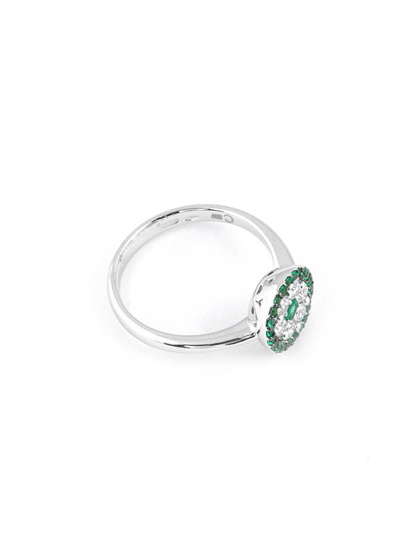 Gioiello firmato Crivelli. Anello in oro bianco 18kt con diamanti e smeraldi disposti a tondino.