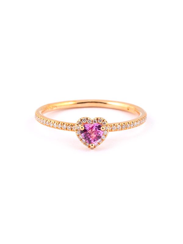 Anello in oro rosa 18kt con zaffiro rosa centrale a forma di cuore contornato da diamanti bianchi. Diamanti bianchi anche sulla parte frontale della montatura.