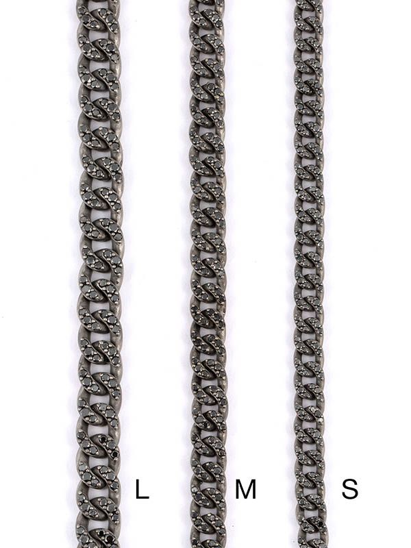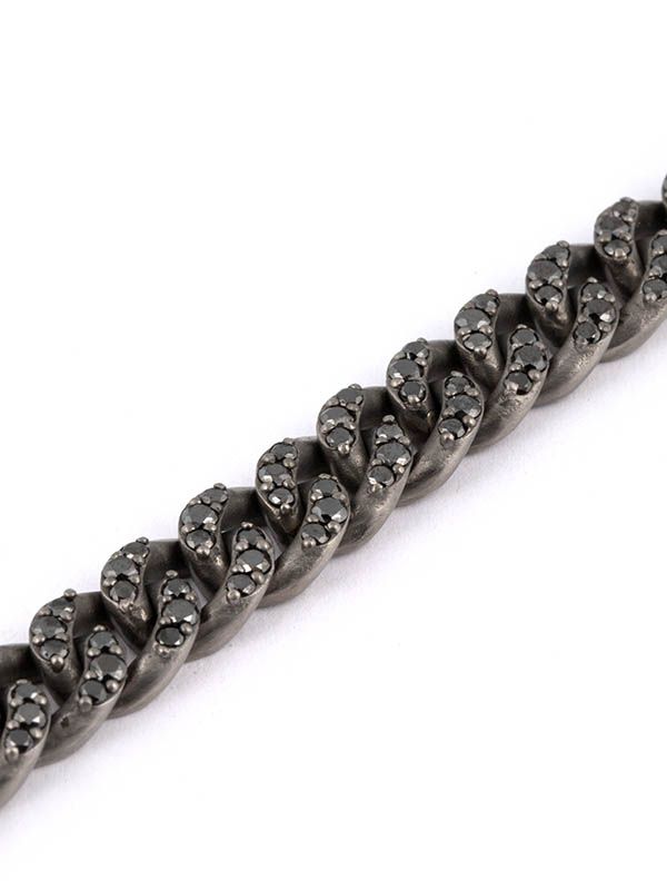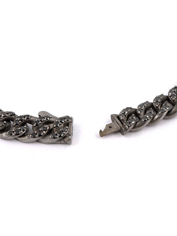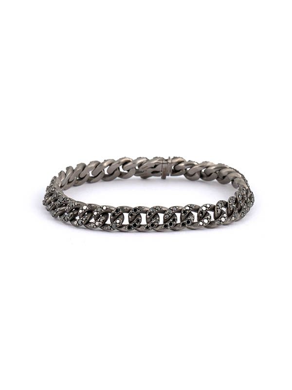 Bracciale groumette in titanio con diamanti neri. Bracciale morbido maglia groumette in titanio, con incastonati sulle maglie diamanti neri taglio brillante. Il bracciale è composto indicativamente da 28 maglie che variano in base alla proporzione del polso. La montatura di questo bracciale è di un’eleganza classica e senza tempo, resa particolare grazie all’attenzione per i dettagli. La particolarità sta anche nella chiusura che scompare letteralmente una volta indossato, così che non si possano distinguere l’inizio e la fine del bracciale: in questo modo assume la forma di una catena luminosa continua. Gioiello realizzato in Italia. Per qualsiasi necessità o richiesta particolare, o per prenotare un appuntamento in negozio per valutare il prodotto di persona, non esitate a contattarci, siamo a vostra disposizione.