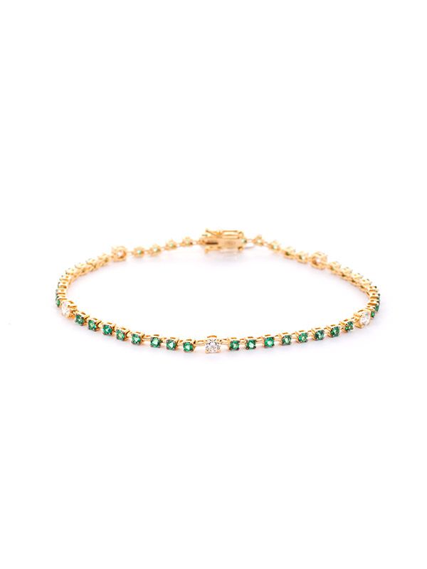 Gioiello firmato Crivelli. Bracciale in oro rosa 18kt con cinque diamanti taglio brillante alternati a smeraldi verdi. Fermaglio di sicurezza.