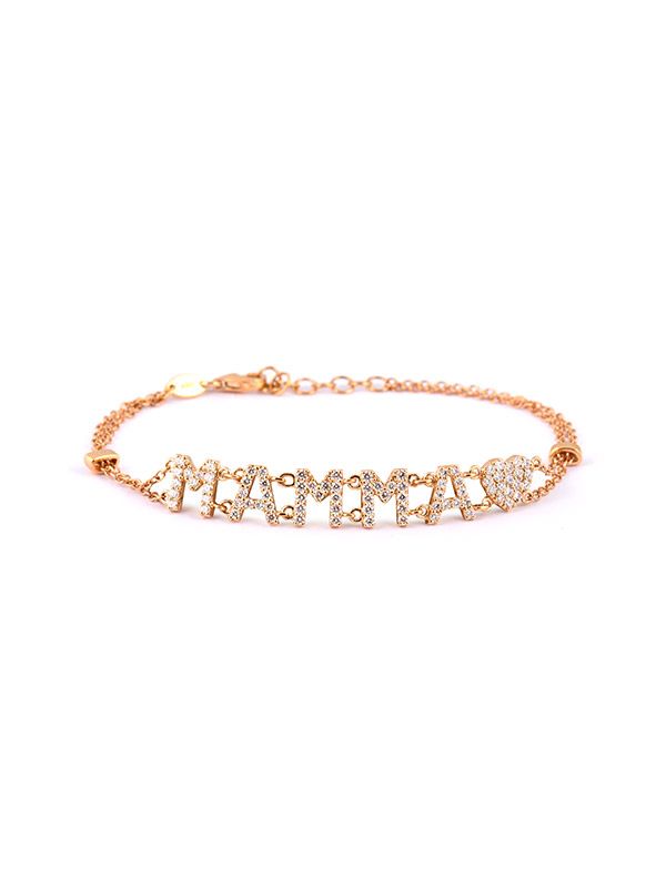 Bracciale in oro rosa 18kt scritta MAMMA e cuore con diamanti bianchi. Catena a maglia rolò doppia. Anellini per la regolazione della misura. Chiusura a moschettone.