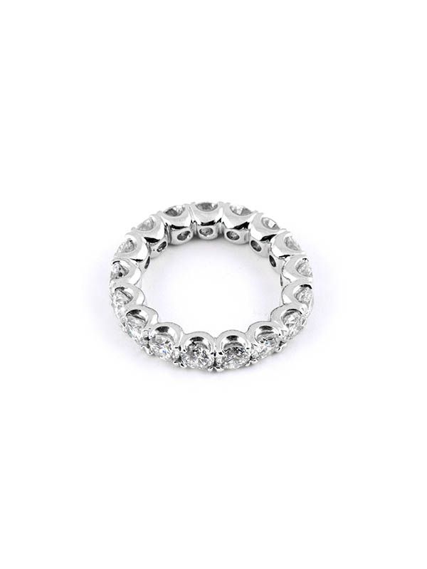 Fedina eternelle in oro bianco 18kt con diamanti. L'eternelle, o girodito, è un anello composto da pietre poste in tutta la circonferenza dell'anello: la più classica è indubbiamente quella realizzata in oro bianco 750% e diamanti naturali taglio brillante. Il numero delle pietre varia in base alla proporzione e alla misura. La montatura è realizzata a filo, ovvero ogni pietra è incastonata da 4 griffe. Previo preventivo concordato con noi, l'eternelle può essere realizzata con pietre di diversa caratura e di differente purezza, taglio e colore. Per qualsiasi necessità o richiesta particolare, o per prenotare un appuntamento in negozio per valutare il prodotto di persona, non esitate a contattarci, siamo a Vostra disposizione.