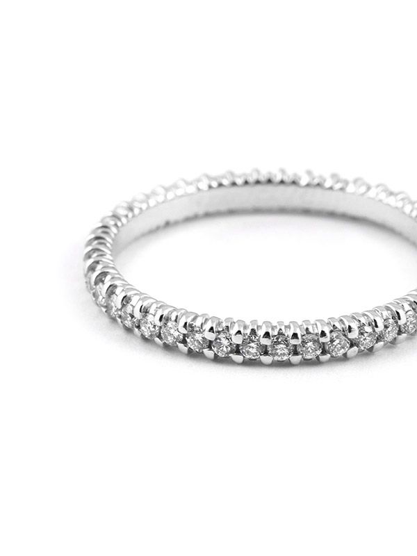 Fedina eternelle in oro bianco 18kt con diamanti. L'eternelle, o girodito, è un anello composto da pietre poste in tutta la circonferenza dell'anello: la più classica è indubbiamente quella realizzata in oro bianco 750% e diamanti naturali taglio brillante. Il numero delle pietre varia in base alla proporzione e alla misura. La montatura è realizzata a filo, ovvero ogni pietra è incastonata da 4 griffe. Previo preventivo concordato con noi, l'eternelle può essere realizzata con pietre di diversa caratura e di differente purezza, taglio e colore. Per qualsiasi necessità o richiesta particolare, o per prenotare un appuntamento in negozio per valutare il prodotto di persona, non esitate a contattarci, siamo a Vostra disposizione.