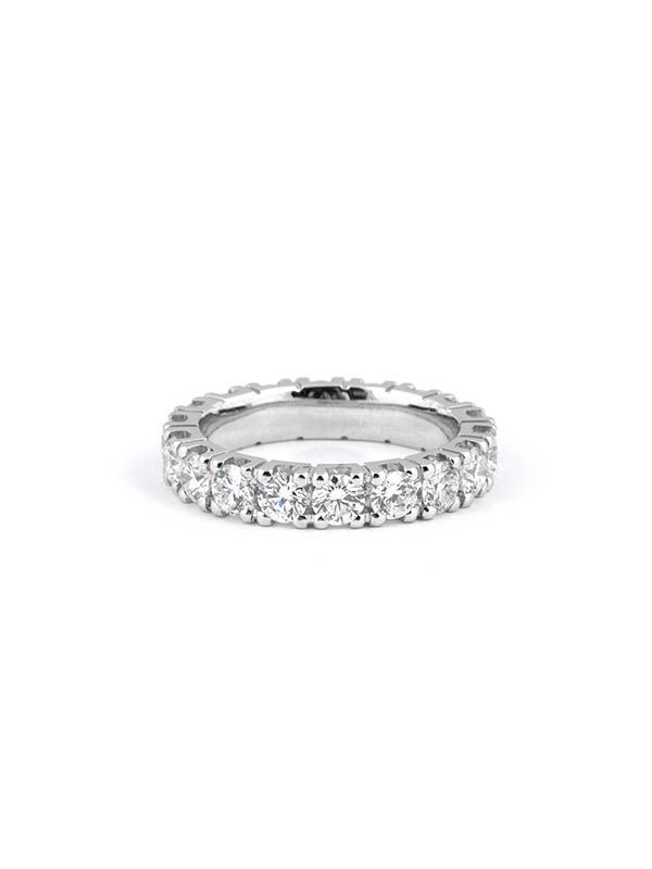 Fedina eternelle in oro bianco 18kt con diamanti. L'eternelle, o girodito, è un anello composto da pietre poste in tutta la circonferenza dell'anello: la più classica è indubbiamente quella realizzata in oro bianco 750% e diamanti naturali taglio brillante. Il numero delle pietre varia in base alla proporzione e alla misura. La montatura è realizzata a filo, ovvero ogni pietra è incastonata da 4 griffe. Previo preventivo concordato con noi, l'eternelle può essere realizzata con pietre di diversa caratura e di differente purezza, taglio e colore. Per qualsiasi necessità o richiesta particolare, o per prenotare un appuntamento in negozio per valutare il prodotto di persona, non esitate a contattarci, siamo a Vostra disposizione.