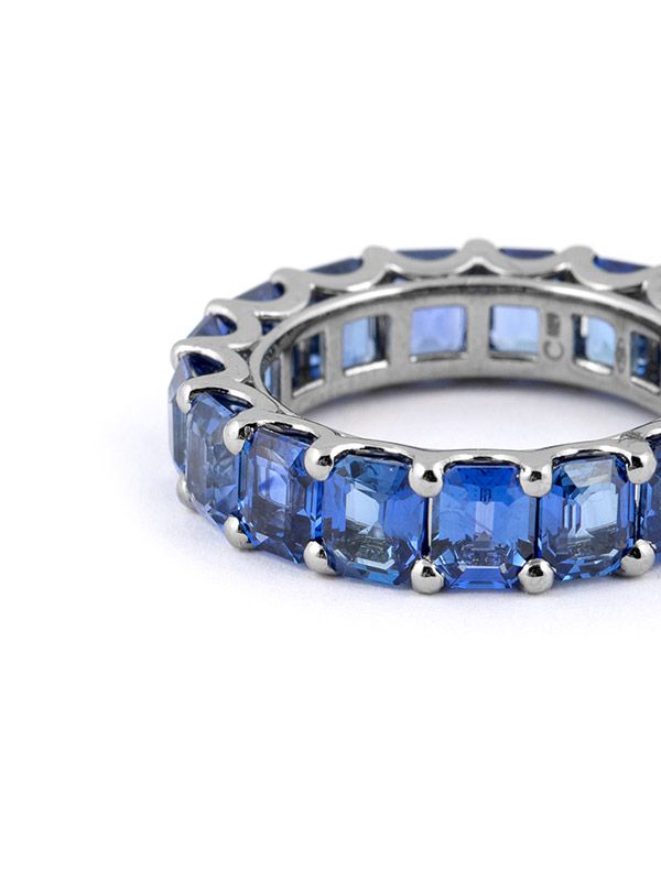 Gioiello firmato Crivelli. Fedina eternelle in oro bianco con zaffiro blu taglio smeraldo. L'eternelle, o girodito fantasia, è un anello composto da pietre poste in tutta la circonferenza dell'anello: realizzata in oro bianco 750% e diamanti naturali con tagli speciali e pietre varie. Previo preventivo concordato con noi, l'eternelle può essere realizzata con pietre di diversa caratura e di differente purezza, taglio e colore. Per qualsiasi necessità o richiesta particolare, o per prenotare un appuntamento in negozio per valutare il prodotto di persona, non esitate a contattarci, siamo a Vostra disposizione.