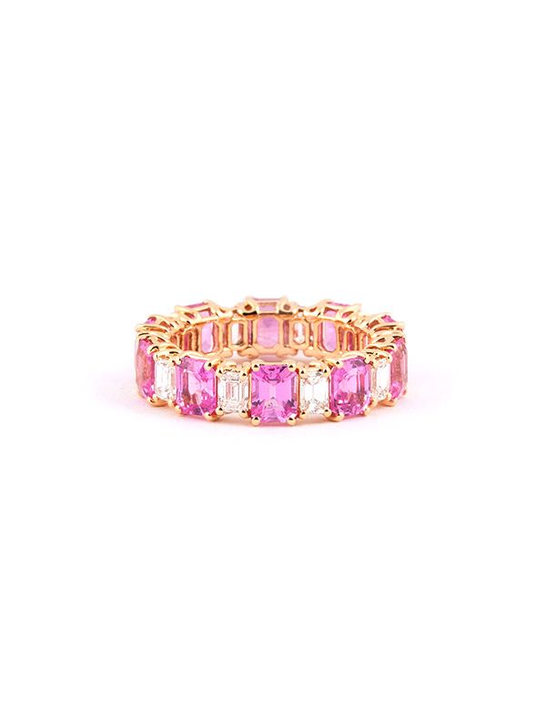 Gioiello firmato Crivelli. Fedina eternelle in oro rosa 18kt con zaffiri rosa taglio ottagonale e diamanti bianchi taglio smeraldo alternati.