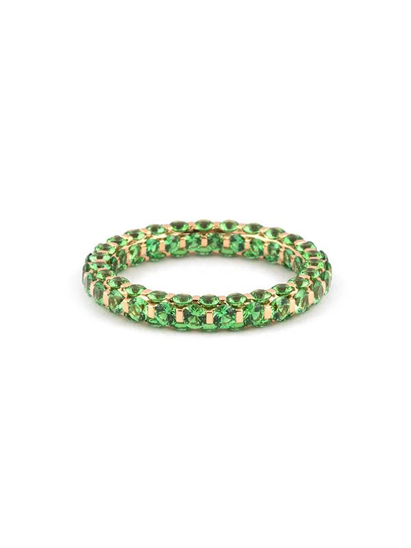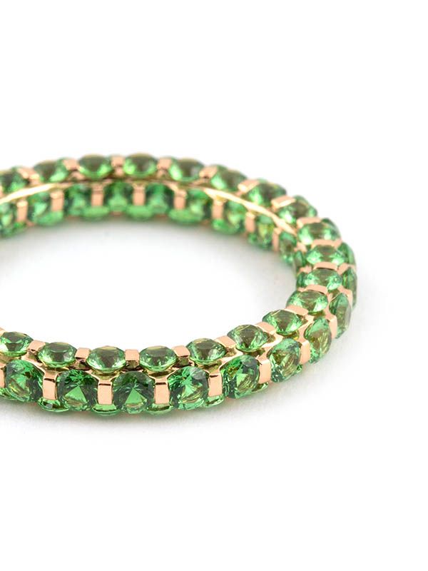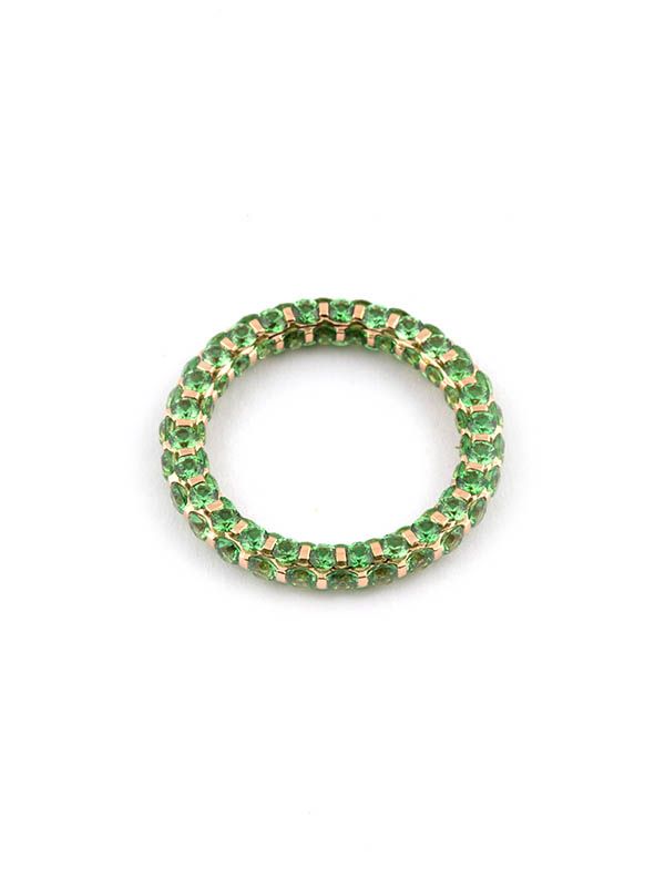 Fedina eternelle in oro rosa 18kt con pietre di tzavorite verde disposte su quattro file, esterne e interne. Questa speciale eternelle è composta da pietre poste in tutta la circonferenza, in tutto il suo interno e nei lati, creando così un giradito completamente realizzato in diamanti taglio brillante e una montatura leggerissima in oro bianco 750%. Il numero delle pietre varia in base alla proporzione e alla misura. Previo preventivo concordato con noi, l'eternelle può essere realizzata con pietre di diversa caratura e di differente purezza, taglio e colore. Per qualsiasi necessità o richiesta particolare, o per prenotare un appuntamento in negozio per valutare il prodotto di persona, non esitate a contattarci, siamo a Vostra disposizione.
