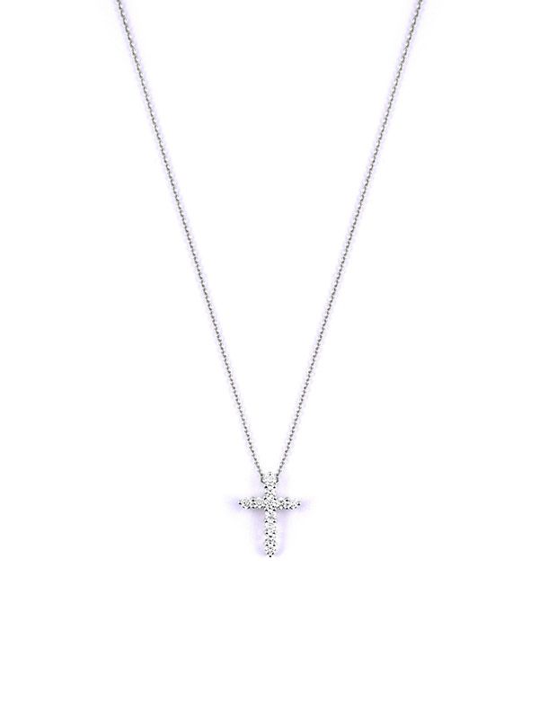 Girocollo in oro bianco 18kt con croce e diamanti bianchi. Catena a maglia rolò lunghezza 40cm. Chiusura a moschettone.