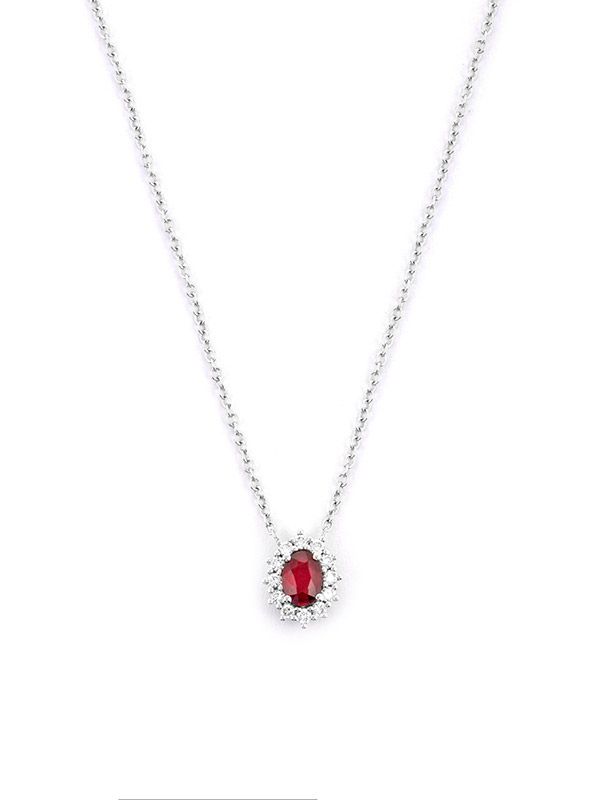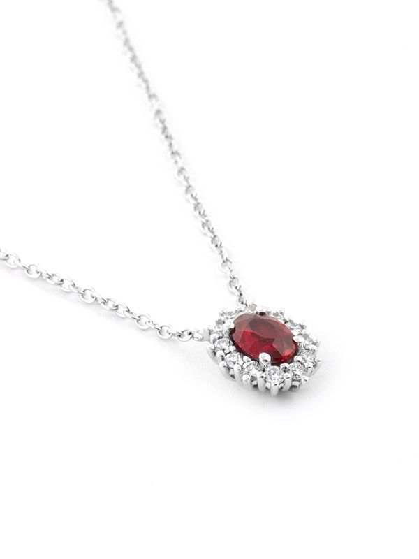 Girocollo in oro bianco 18kt con rubino centrale contornato da diamanti bianchi. Catena a maglia rolò. Chiusura a moschettone.
