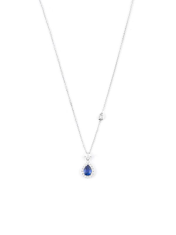 Gioiello firmato Crivelli. Girocollo con catena in oro bianco 18kt e pendente a forma di goccia in oro bianco 18kt con zaffiro blu e diamanti.