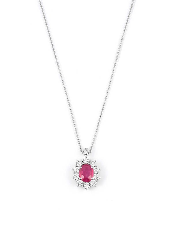 Gioiello firmato Crivellil. Girocollo in oro bianco 18kt con rubino taglio ovale 1,26 ct contornato da 10 diamanti taglio brillante. Catena a maglia rolò lunghezza 42cm. Chiusura a moschettone.