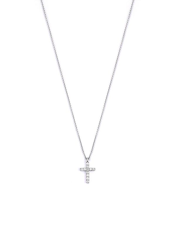 Girocollo in oro bianco 18kt con croce decorata da diamanti bianchi. Dimensione croce 12mmx9mm. Catena a maglia rolò e chiusura a moschettone.