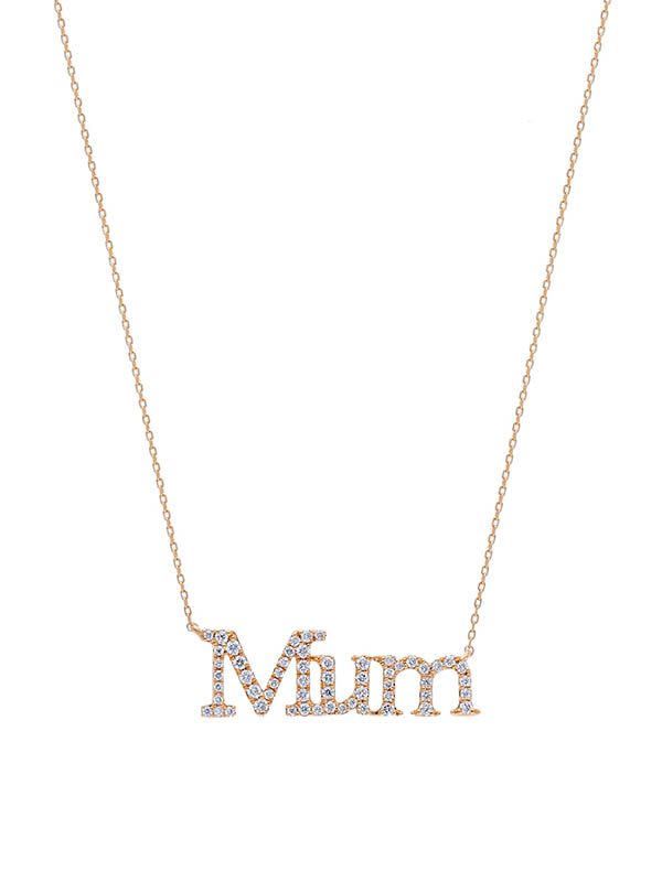 Girocollo in oro rosa 18kt con scritta MUM decorata con diamanti bianchi. Catena a maglia rolò saliscendi lunghezza 40mm. Chiusura a moschettone. Lunghezza regolabile a piacere.