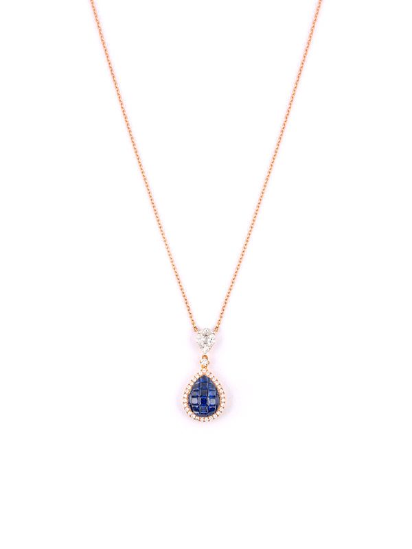 Girocollo in oro rosa 18kt con pavé di zaffiri blu a forma di goccia contornata da diamanti bianchi. Diamanti taglio multiplo sul pendente. Catena a maglia rolò lunghezza 40cm e chiusura a moschettone con secondo anellino per la regolazione della lunghezza.