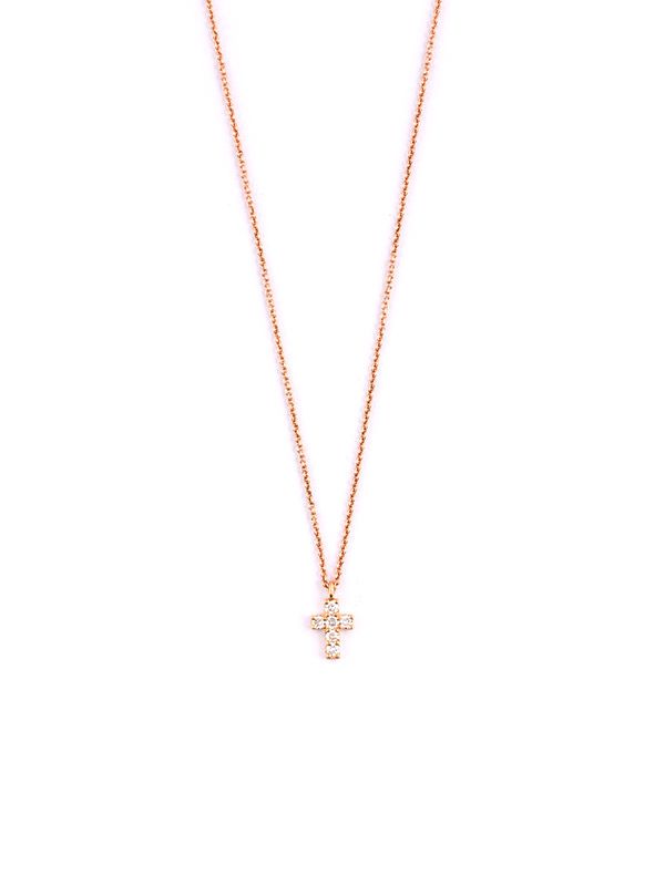 Girocollo in oro rosa 18kt con croce decorata con diamanti bianchi. Dimensione croce 7mmx5mm. Catena a maglia rolò lunghezza 42cm. Chiusura a moschettone e socondo anellino per la regolazione della lunghezza.