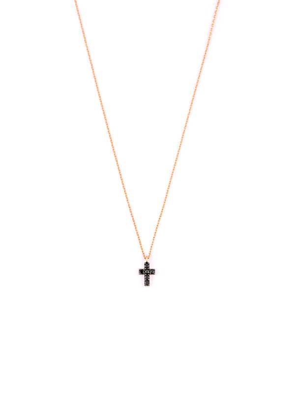 Girocollo in oro rosa 18kt con croce decorata da diamanti neri. Catena sottile a maglia rolò lunghezza 40cm. Chiusura saliscendi regolabile.