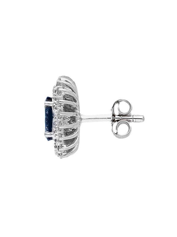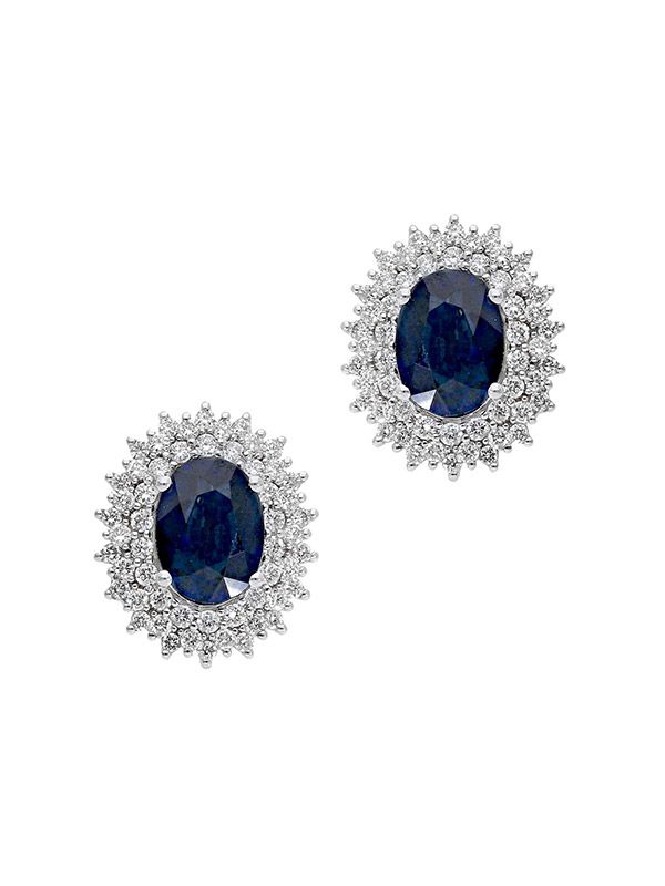 Orecchini lobo in oro bianco 18kt con zaffiri taglio ovale contornati da tre file di diamanti bianchi taglio brillante. Chiusura a farfallina.